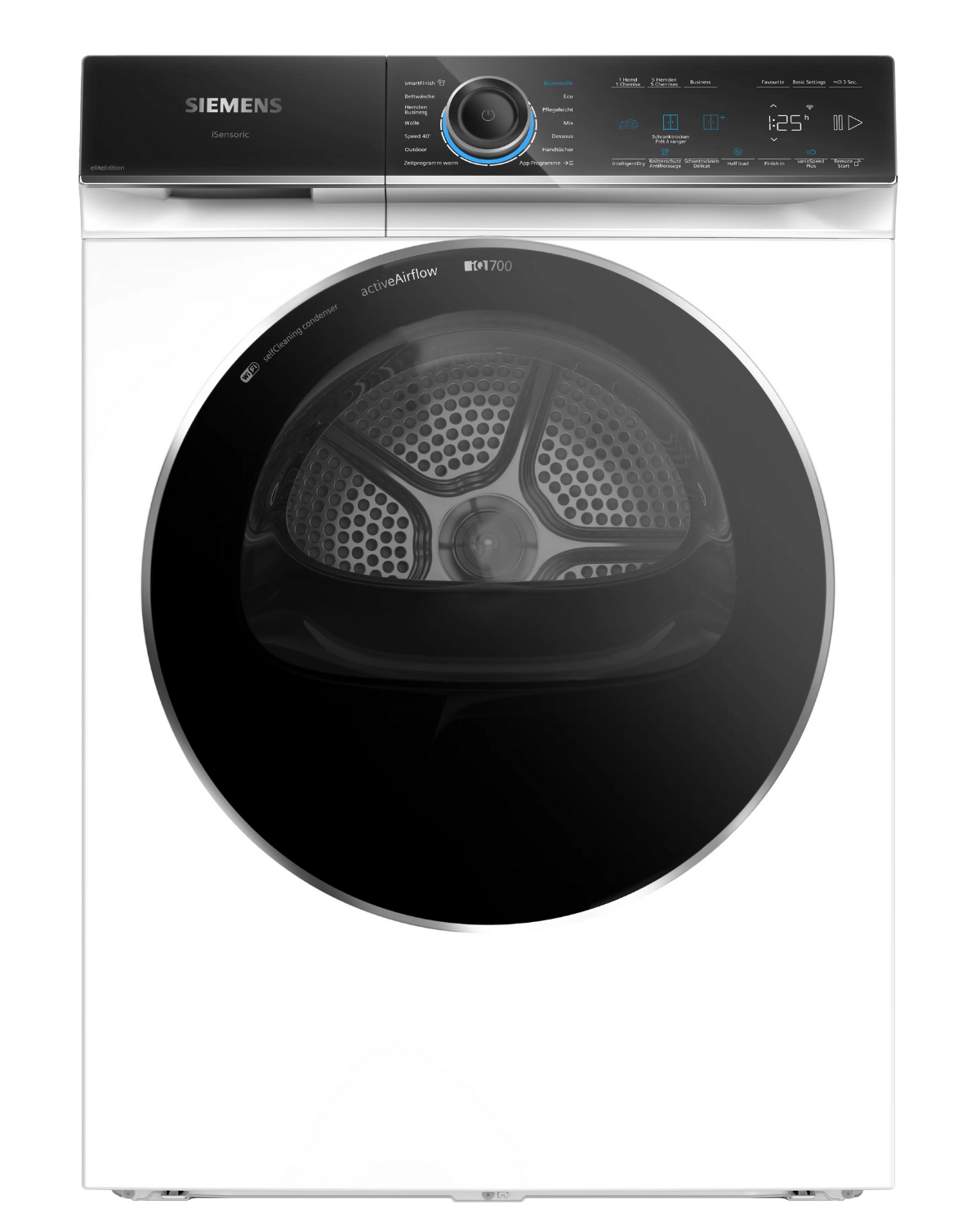 App-Programme (via Home Connect): Zusätzliche Programme wie "Trocknen im Korb", "Kopfkissen" oder "Silent Dry" können heruntergeladen werden.
